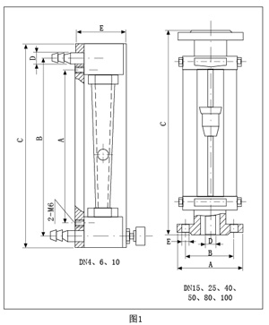 RZ-LZB/LZB-( )F流量計的錐管為光滑內壁管(見圖4),通徑DN15以上的流量計,浮子通過導桿 上下移動,保持穩定;RZ-LZJ/LZJ-( )F流量計錐管 內壁有三條導向凸筋,使浮子保持穩定(見圖4)。通徑DN10以下的流量計采用軟管連接,配有 針形流量調節閥;通徑DN15以上流量計采用法蘭連接。