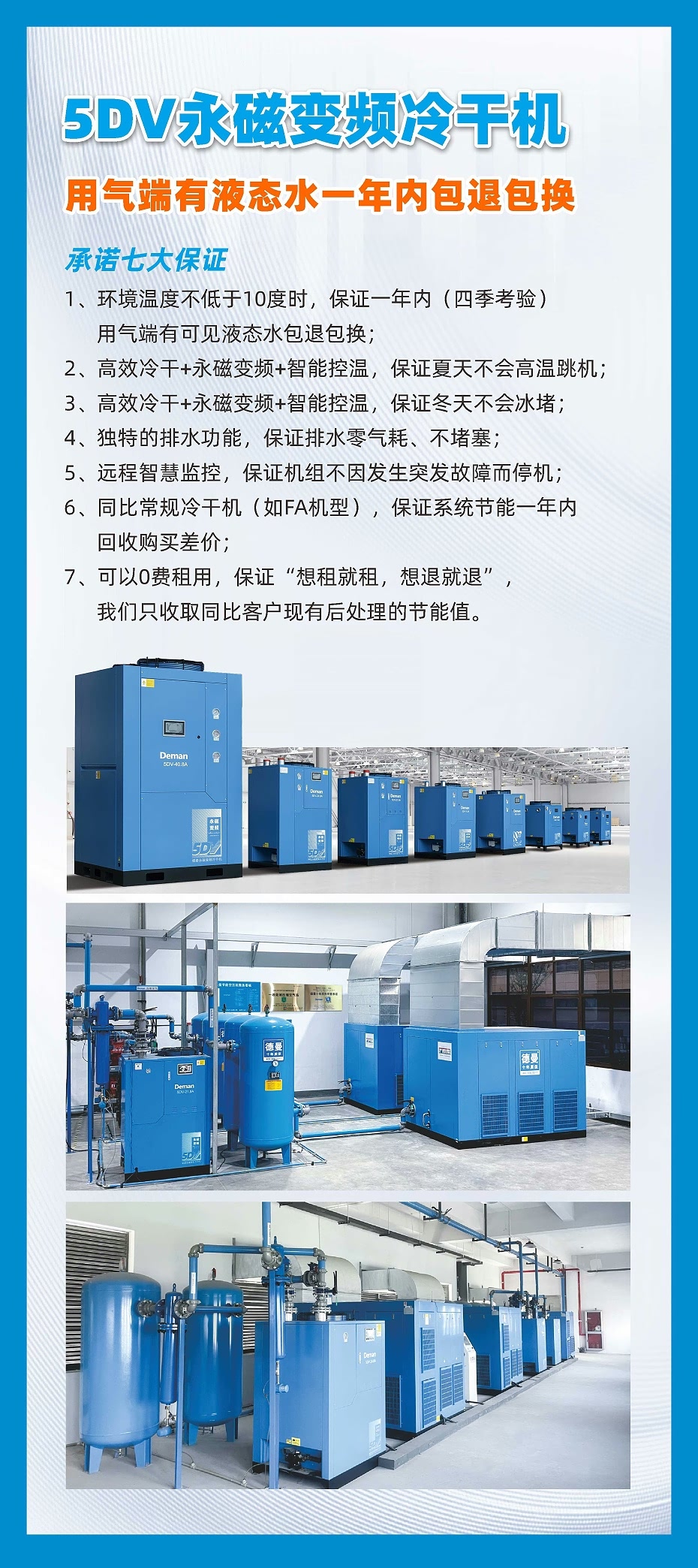 1、環境溫度不低于10度時,保證一年內(四季考驗),用氣端有可見液態水包退包換;2、高效冷干+永磁變頻+智能控溫,保證夏天不會高溫跳機;3、高效冷干+永磁變頻+智能控溫,保證冬天不會冰堵;4、獨特的排水功能,保證排水零氣耗、不堵塞;5、遠程智慧監控,保證機組不因發生突發故障而停機;