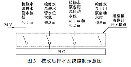 現場安裝磁翻板液位計時, 裝置標尺的0 位, 對應的實地高程為EL .40 .0 m 。浮子開關設定5 個水位動作值, 檢修水位低開關量報警值對應的高程為40 .3 m ;停止所有檢修水泵的開關量, 所對應的高程為40 .5 m ;啟動主用檢修水泵的開關量, 所對應的高程為40 .9 m ;啟動檢修水泵主用泵的開關量, 以及要求手動啟動大泵, 并作為水位高報警上送上位機, 所對應的高程為41 .1 m 與41 .2 m , 兩個開關量并列接入。全部開關量分別送入PLC , 如圖3所示。