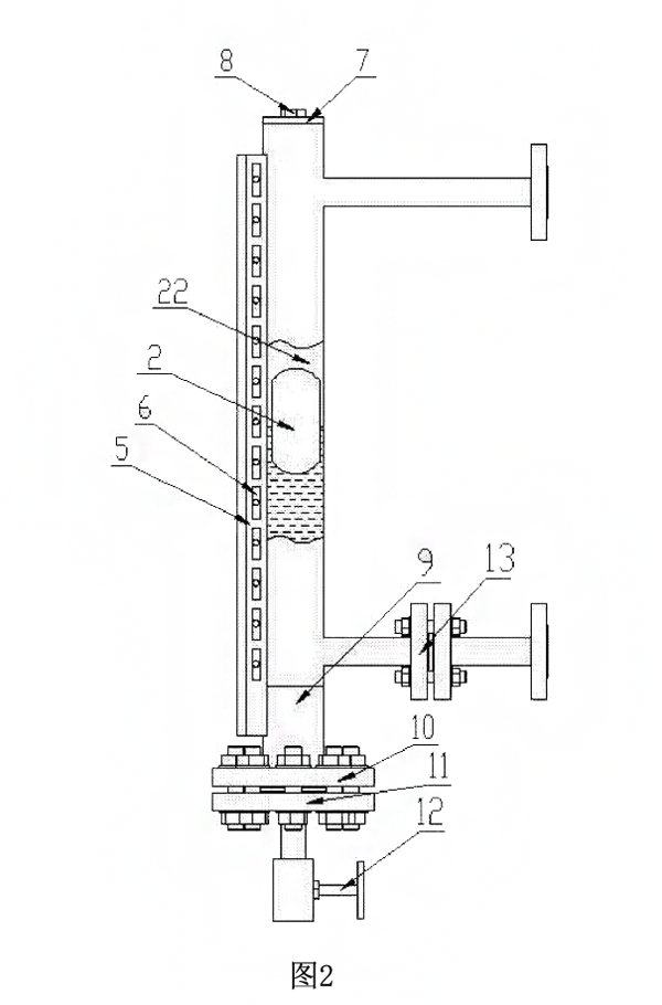 磁浮球呈膠囊狀且內(nèi)部設有空腔,磁浮球一端開口,磁浮球的空腔內(nèi)安裝有兩個加強支撐環(huán),兩加強支撐環(huán)之間安裝有環(huán)形**強磁鋼塊,磁浮球開口端焊接有封堵頭。氣泡消除器與磁浮球通道連通的一端安裝有濾網(wǎng),濾網(wǎng)上設有不規(guī)則形狀的碎泡口,有機玻璃管一端安裝有密封的堵頭,另一端安裝有單向閥堵頭,單向閥堵頭上安裝用于將有機玻璃管內(nèi)氣體抽出的單向閥作為優(yōu)選的技術(shù)方案,液位計主體內(nèi)磁浮球通道的直徑比磁浮球的外直徑大-mm。