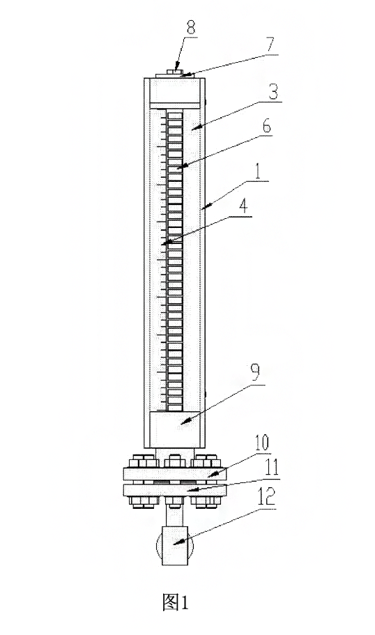 以下附圖僅旨在于對本新型做示意性說明和解釋,并不限定本新型的范圍。其中圖是本新型磁翻板液位計實施例的結(jié)構(gòu)示意圖