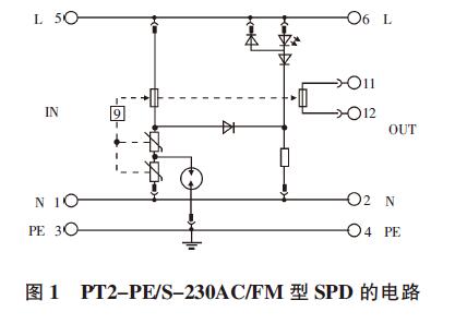 (1)圖1 電路由氣體放電管(粗保護(hù))、壓敏電阻(細(xì)保護(hù))、發(fā)光二極管、熔絲組成。IN 端接電涌電流來向, OUT 端接被保護(hù)設(shè)備, 端子L 和N 分別接1 對220 V 火線、零線。端子3 和4 端子任選1 個接地, 如果金屬導(dǎo)軌已接地, 此接地線可不接。端子11 和12 接1 對開關(guān)量報(bào)警回路。當(dāng)電涌電流從IN 端進(jìn)入SPD, 細(xì)保護(hù)壓敏電阻在25 ns 內(nèi)啟動, 限制火線、零線之間出現(xiàn)過電壓。當(dāng)火線或零線電壓抬升至940 V 以上時,粗保護(hù)氣體放電管在100 ns 內(nèi)擊穿, 對地放電,可泄放10 kA(8/20 μs)電涌電流, 壓敏電阻限制電壓至1.1 kV, 泄放完成后各器件恢復(fù)常態(tài)。當(dāng)