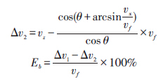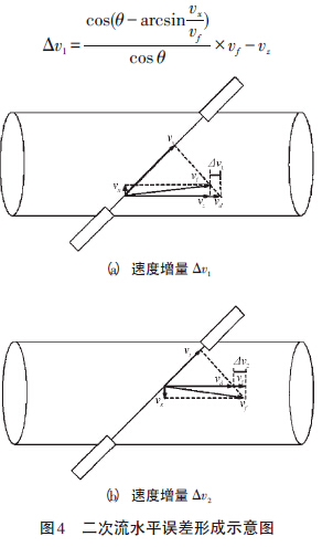 二次流水平速度(X 方向的分速度)直接影響了超聲波流量計的軸向檢測平面,對檢測造成了非常大的影響。聲道線在空間上先后收到方向相反的二次流水平速度的作用,這在很大程度上削弱了誤差。但反向速度并不完全相等,且超聲波流量計是按固定角度進行速度折算的,超聲波傳播速度vs 對應地固定為軸向流速為vd ,而其真實流速為vf ,由此二次流徑向兩個相反的水平速度,分別導致了Δv1(如圖4(a)所示)和Δv2(如圖4(b)所示)兩個速度變化量,其中Δv1 導致測得的流速偏大,Δv2 導致測得的流速偏小,兩個誤差不能抵消,產生二次流的水平誤差Eb :
