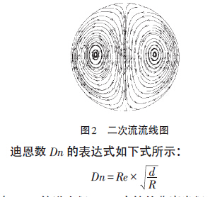 流體流經彎管,管內流體受到離心力和粘性力相互作用,在管道徑向截面上形成一對反向對稱渦旋如圖2所示,稱為彎管二次流。有一無量綱數,迪恩數Dn 可用來表示彎管二次流的強度。當管道模型固定時,迪恩數Dn 只與雷諾數Re 有關。研究發現,流速越大,產生的二次流強度越大,隨著流動的發展二次流逐漸減弱。