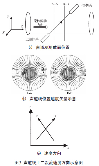 式中:d —管道直徑,R —彎管的曲率半徑。彎管下游形成的二次流在徑向平面的流動,產生了彎管二次流的垂直誤差和水平誤差。聲道線上二次流速度方向示意圖如圖3所示。本研究在聲道線路徑上取兩個觀察面A和B,如圖3(a)所示;聲道線穿過這兩個二次流面的位置為a和b,如圖3(b)所示。可見由于聲道線穿過截面上渦的位置不同,作用在聲道線上的二次流速度方向也不同,如圖3(c)所示。其中,徑向平面二次流速度在水平方向( X 方向)上的分速度,方向相反。