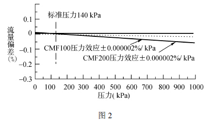 從圖2 中, 我們可以看出壓力對測量準確度的影響:當工藝壓力增大, 會使流量計產生一個負向偏差, 表現為流量顯示值比實際值偏小;當壓力減小時, 會使流量計產生一個正向偏差, 表現為流量顯示值比實際值偏大。