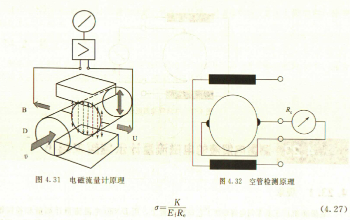 電磁流量計是專為測量導電液體的體積流量而設計的。測量原理是基于法拉第電磁感應定律。按照該定律,導電流體通過磁場作切割磁力線運動時,在垂直于磁場及流速的方向上產生感應電動勢,此電動勢由4.14節中的式4.24)給出。其原理如圖4.31所示。
