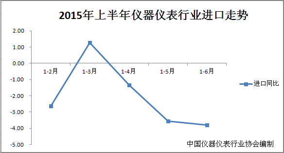 今年上半年,儀器儀表進口延續了2014年的下行走勢,除1-3月略有回調外,其他月份均為負增長。1-6月,161類產品中57.7%同比下降。進口數據 中,氣體或煙霧分析儀同比下降22.23%,減壓閥降幅為11.22%,氣相色譜儀基本與去年持平,進口金額1.27億美元;此外,試驗臺、物鏡、質譜聯 用儀兩位數增長,分別為:11.93%,19.49%,30.68%,液相色譜儀一位數增幅(8.73%)。